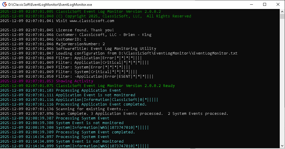 When first run, the application will search the event logs for any entries that match the filtering. The application keeps track of the last entries it searched and will prevent duplicate messages from being sent.